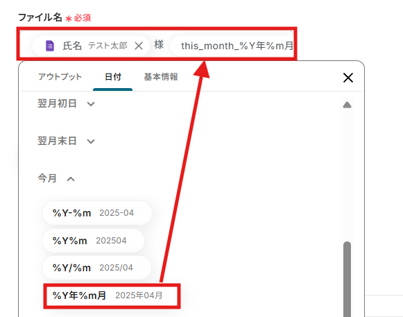 (氏名)には「アウトプット」の「フォームに回答が送信されたら」内にある「氏名」を選択し、(当月)には「日付」の「今月」を選択して設定しています。