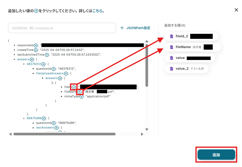 取得したい回答内容が記載された「+」ボタンをクリックして、「追加」をクリックしましょう。