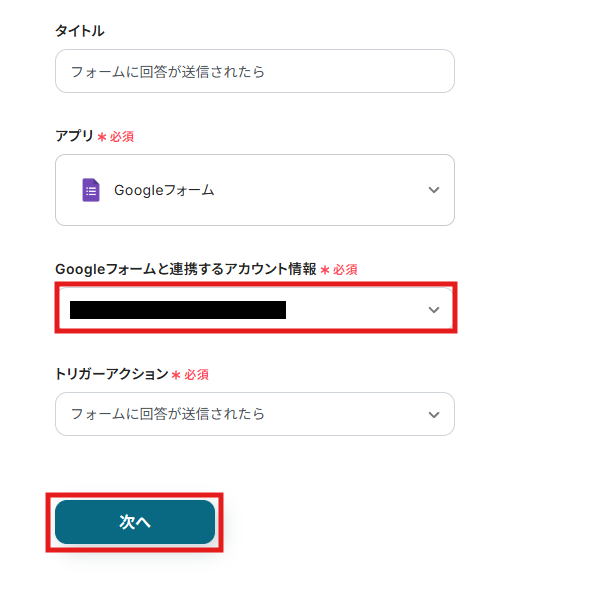 (2) 「Googleフォームと連携するアカウント情報」で、フローボットの運用に使用したいアカウントを選択し、「次へ」をクリックします。
