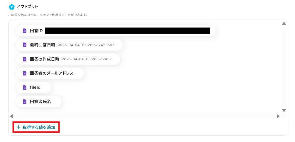 (6) 「+取得する値を追加」をクリックすると、抽出された回答情報が表示されます。