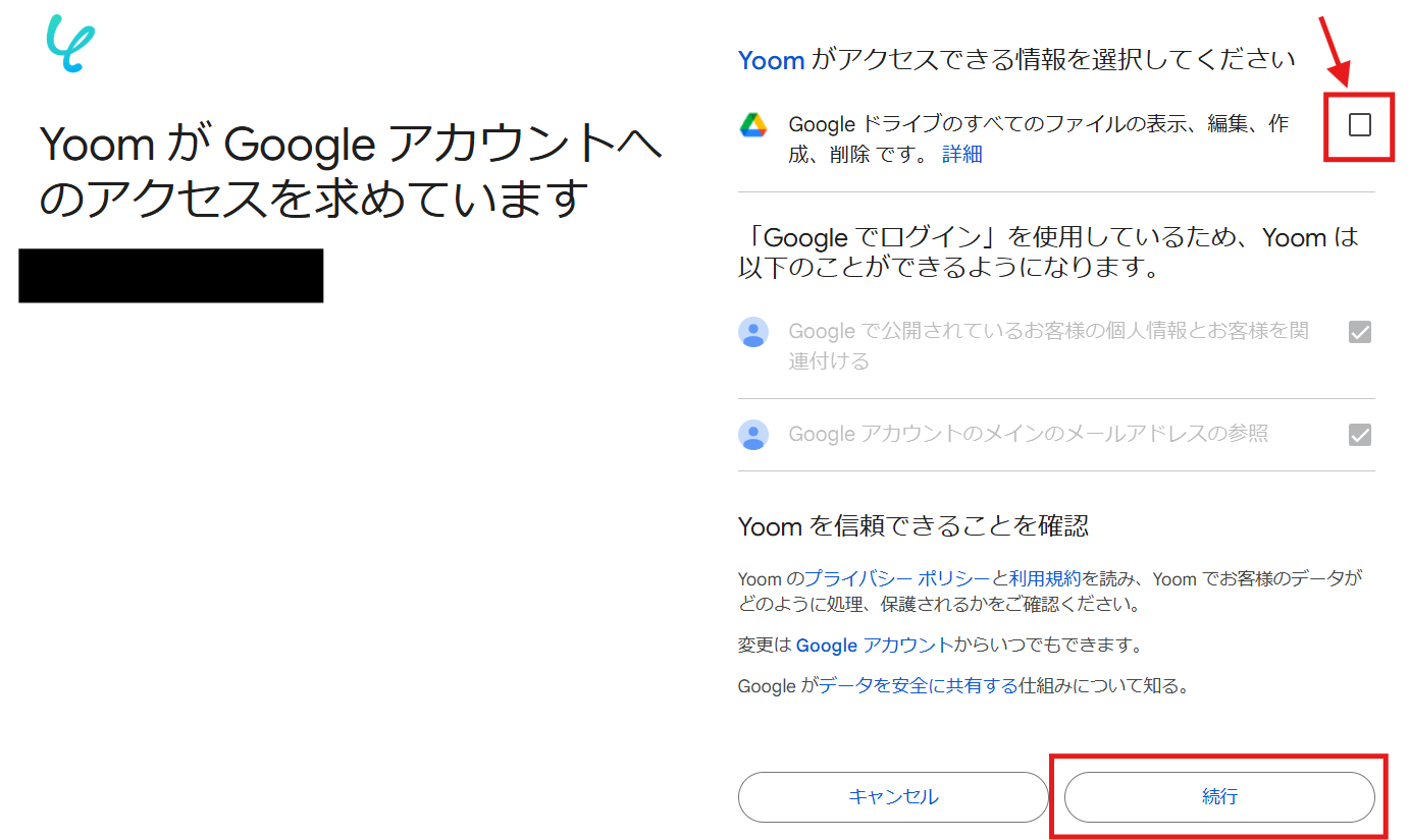 (4) 「Yoomがアクセスできる情報を選択してください」のチェックボックスをすべてチェックし、「続行」をクリックしてください。
