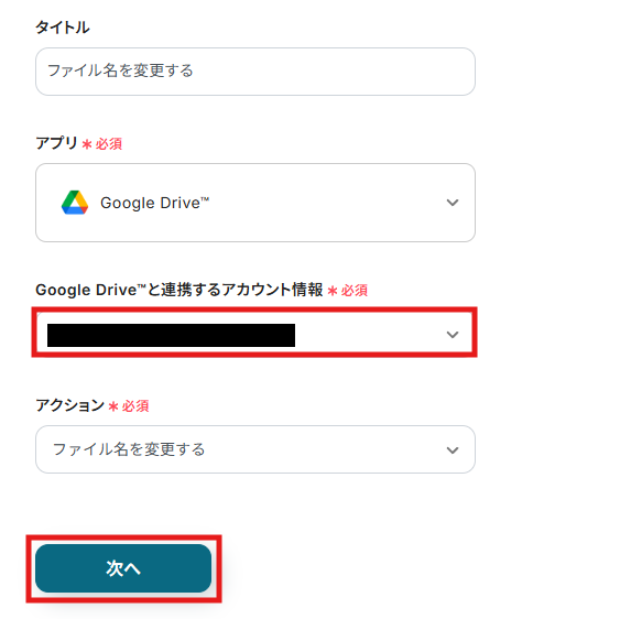 (2) 「Google Driveと連携するアカウント情報」で、フローの運用に使用するGoogle Driveのアカウントを選択してください。
