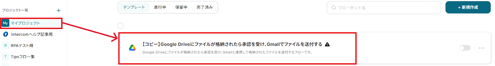 マイアプリ登録が完了したら画面左の「マイプロジェクト」をクリック! Google Driveアイコンの「【コピー】Google Driveにファイルが格納されたら承認を受け、Gmailでファイルを送付する 」を押しましょう。