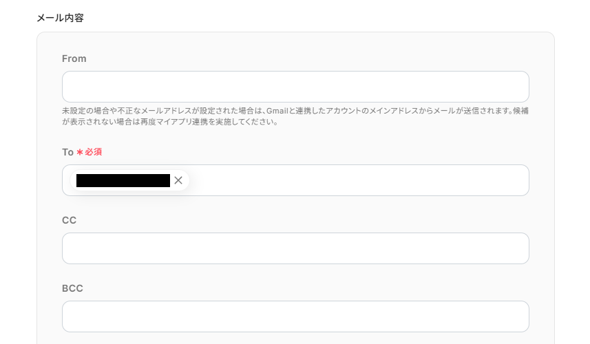 メールの設定というページに移行したら、必須項目を埋めていきましょう。 「To」にはメール送信先のアドレスを設定し、「BCC」「CC」も必要に応じて適宜設定してください。