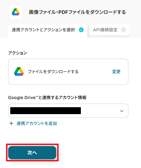 連携アカウントとアクションを選択というページに移動します。 Yoomで作成しているテンプレートを使用しているため、必要な情報はあらかじめ入力されている状態なので、次へをクリックしましょう。