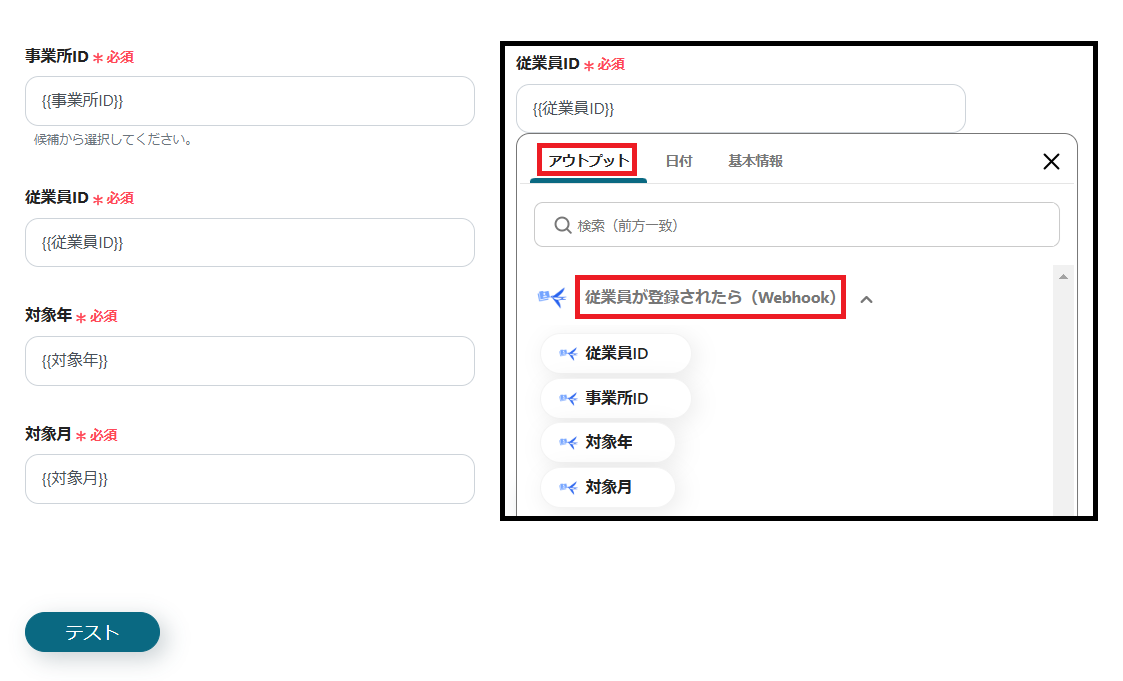 ※各項目は、枠をクリックして表示されるアウトプットの「従業員が登録されたら(Webhook)」から設定します。(値は二重括弧で表示されます)