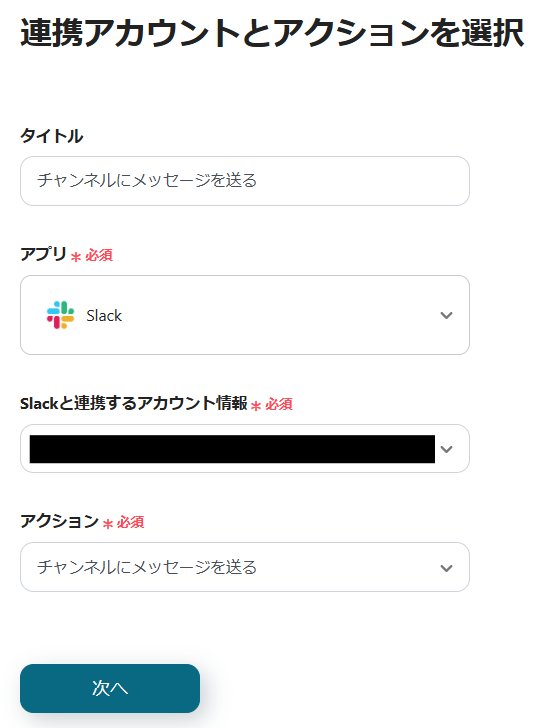 ・Slackと連携するアカウントを確認し、「次へ」をクリックします。
