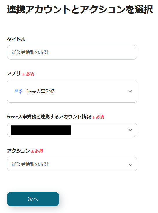 ・freee人事労務と連携するアカウントを確認し、「次へ」をクリックします。