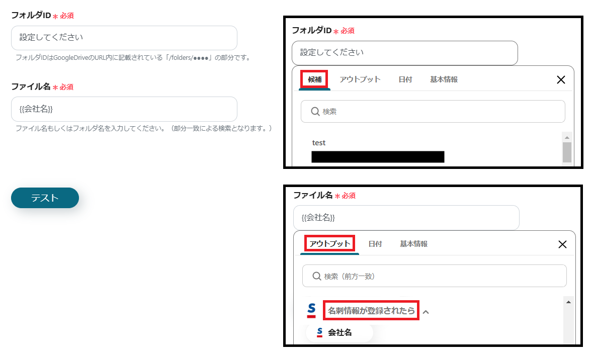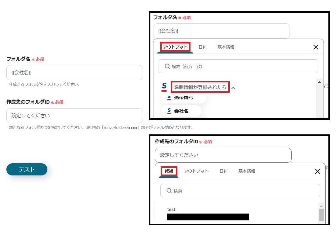 ※フォルダIDは、枠をクリックして表示される「候補」から設定できます。