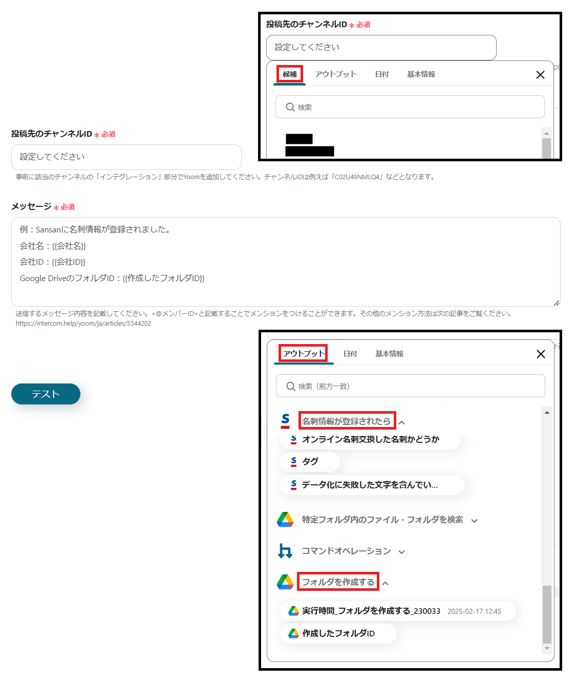 ※メッセージには、定型文を直接入力できます。Sansanや作成したフォルダ情報を反映させる場合は、枠をクリックして表示されるアウトプットの「名刺情報が登録されたら」や「フォルダを作成する」から設定します。(値は二重括弧で表示されます)