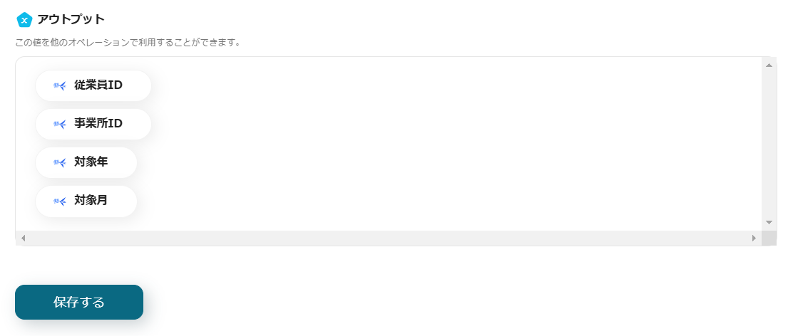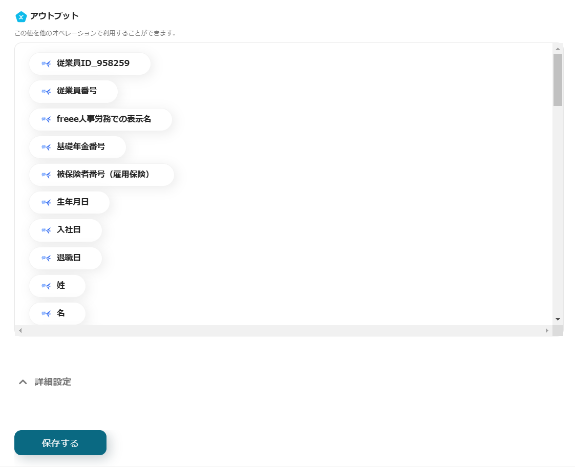 ・テストが成功すると、freee人事労務から取得した従業員情報がアウトプットに登録されます。