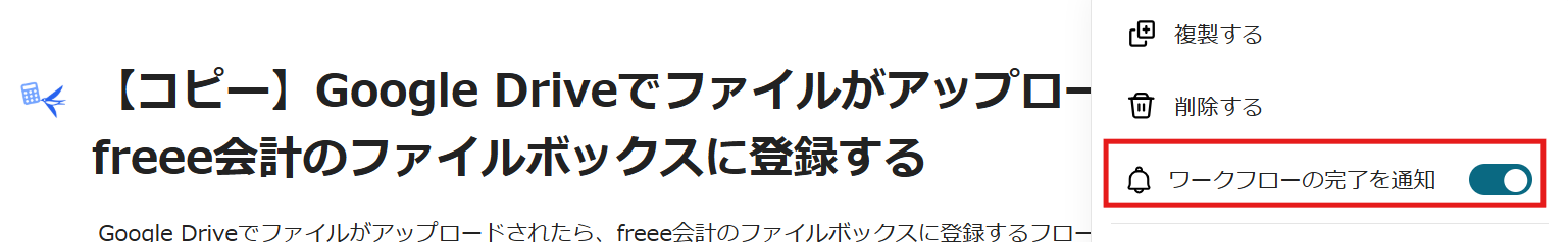 テンプレートの最後に通知フローがない場合、こちらをオンにすることでフローボットが完了した通知を受け取れます。