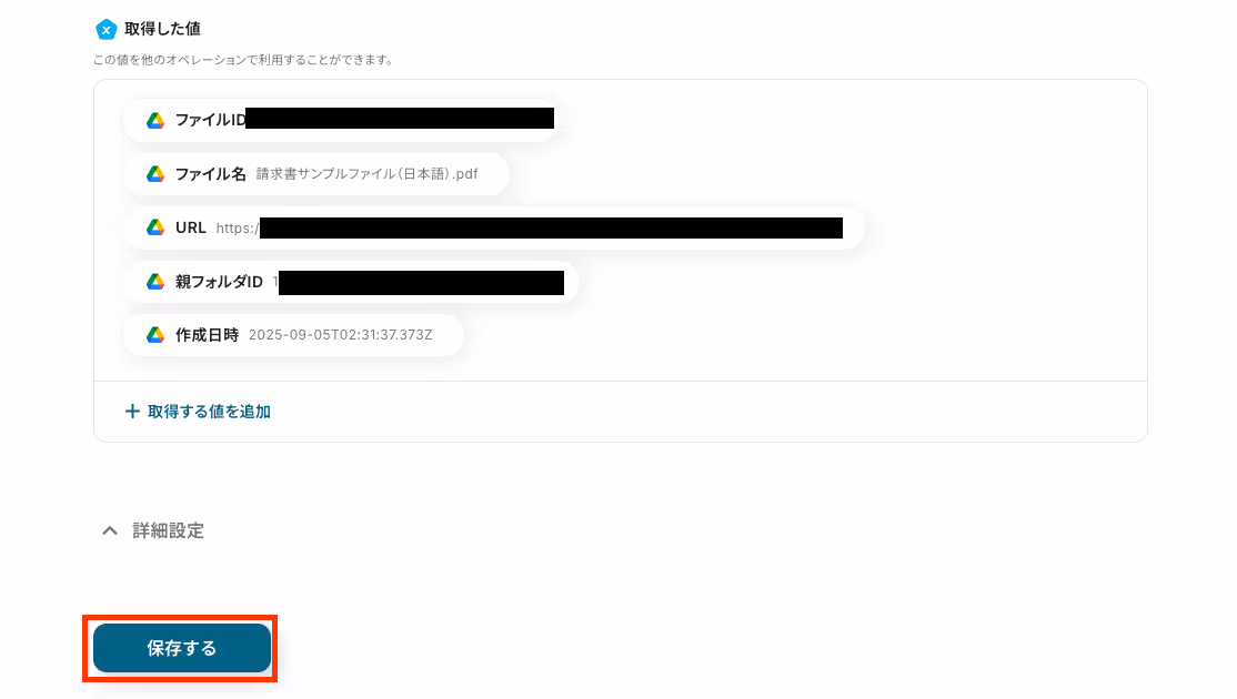 続けてフォルダにアップロードされたファイル情報を取得する設定を行います。