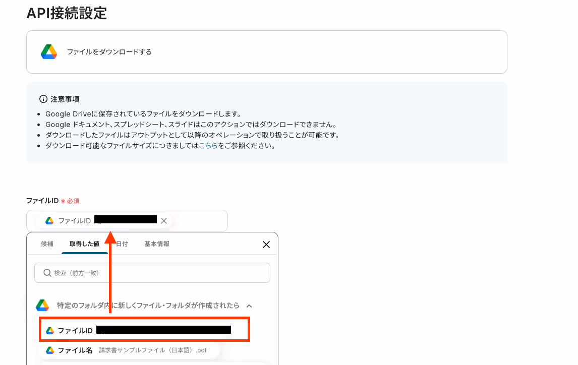 次の画面で、「ファイルID」をアウトプットから選択・設定しましょう。