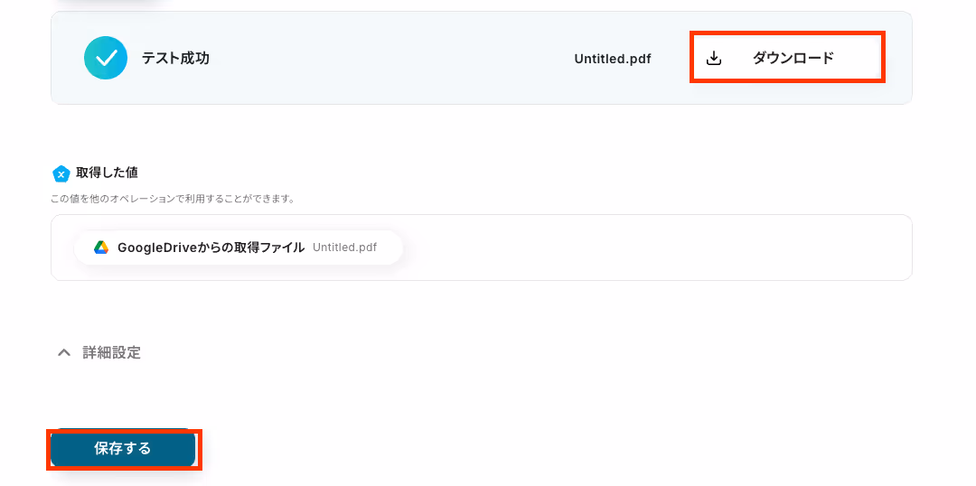 「ファイルの添付方法」でプルダウンから、前ステップから【取得した値を使用する】よう設定し、「ファイル」は【GoogleDriveからの取得ファイル】を指定します。設定後、テストボタンを押しましょう。