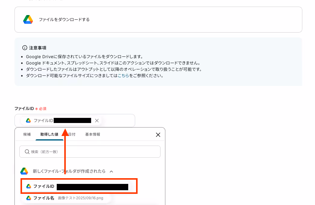次の画面で設定する「ファイルID」は、以下の画面のように入力バーをクリックすると前ステップから取得したアウトプットを引用できます。
