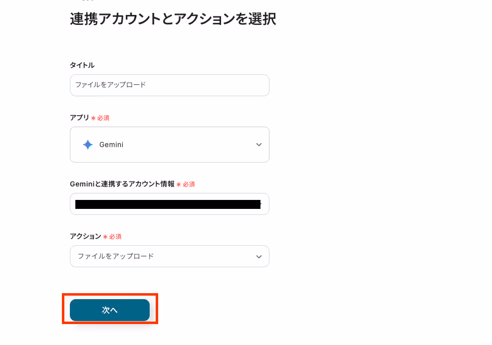 連携するアカウント情報が入力されていることを確認してください。確認後、[次へ]をクリックします。