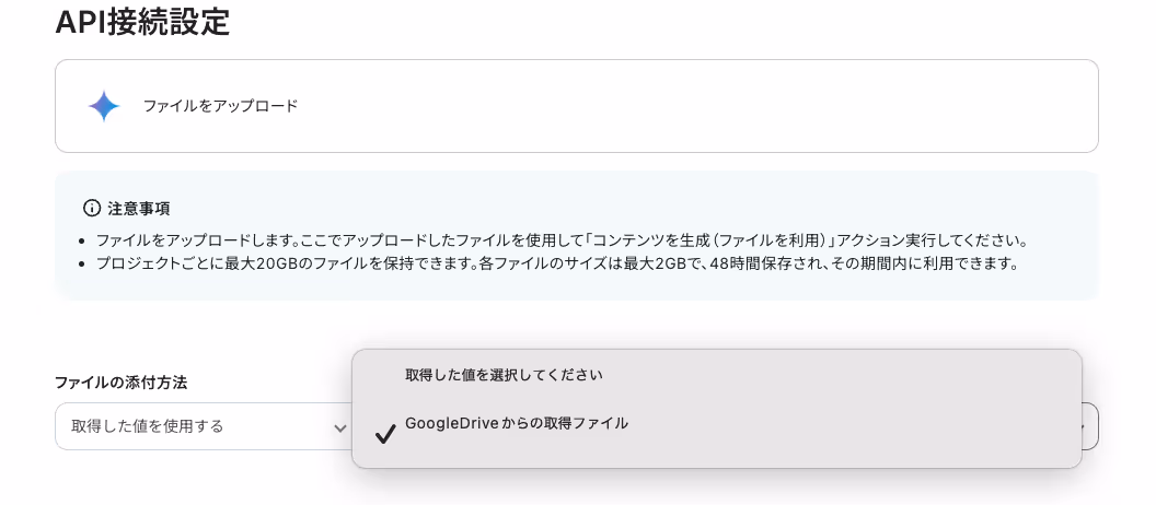 次の画面で「ファイルの添付方法」を指定します。今回は、前ステップで取得したGoogleDriveからの取得ファイルをプルダウンから設定しましょう。