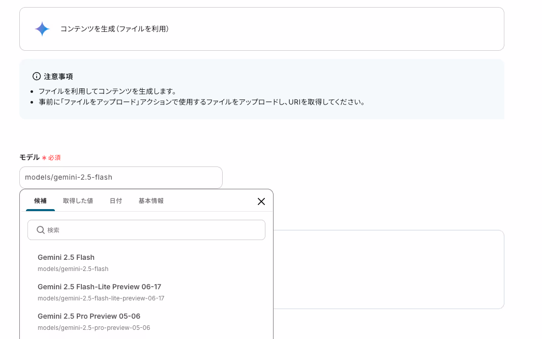 まずは使用するGeminiのモデルタイプを入力します。
