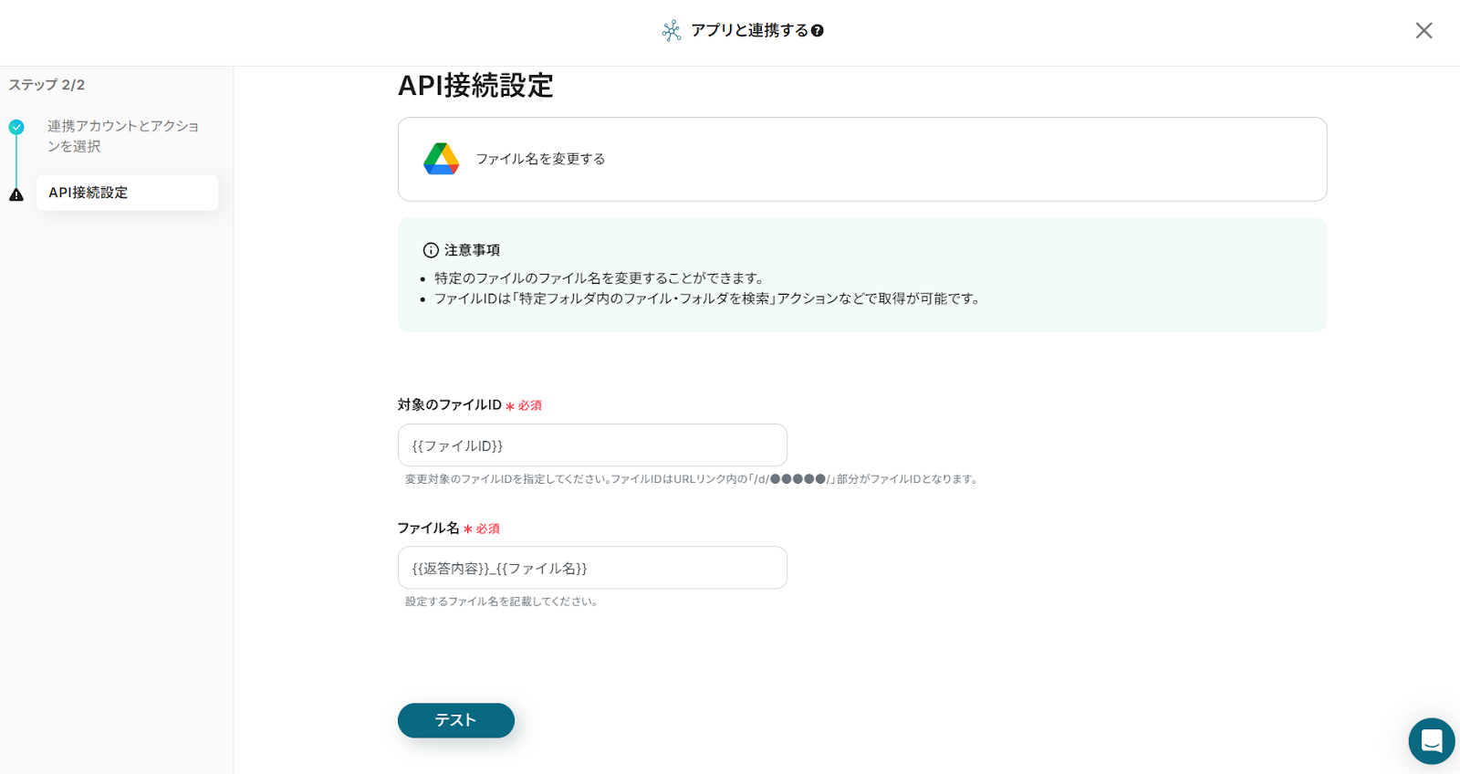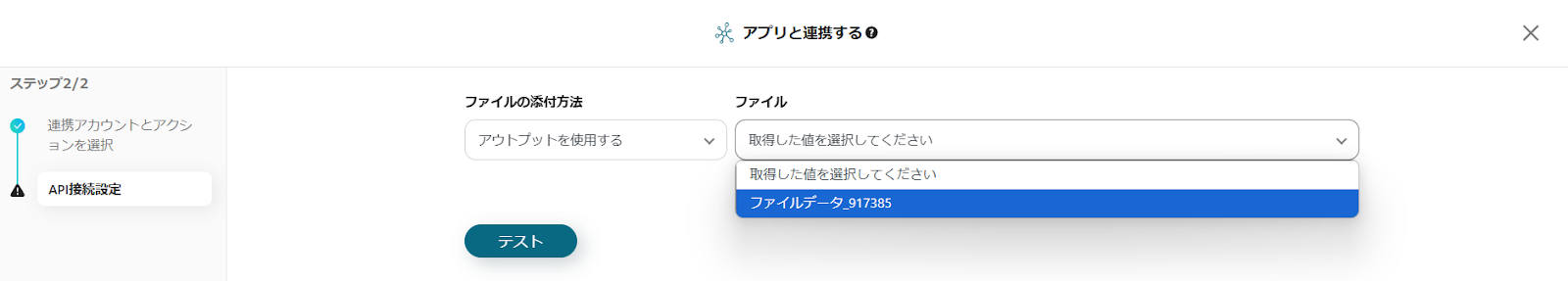 なお、ファイルはプルダウンからテスト送信したものを選択しましょう。