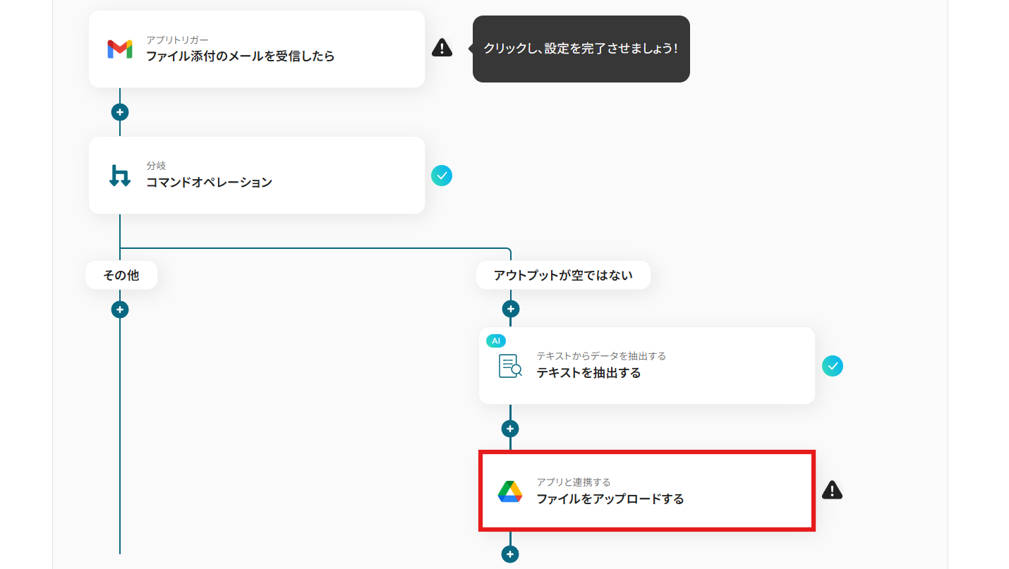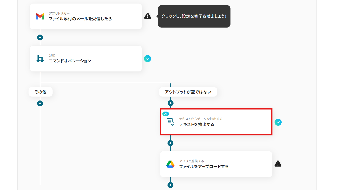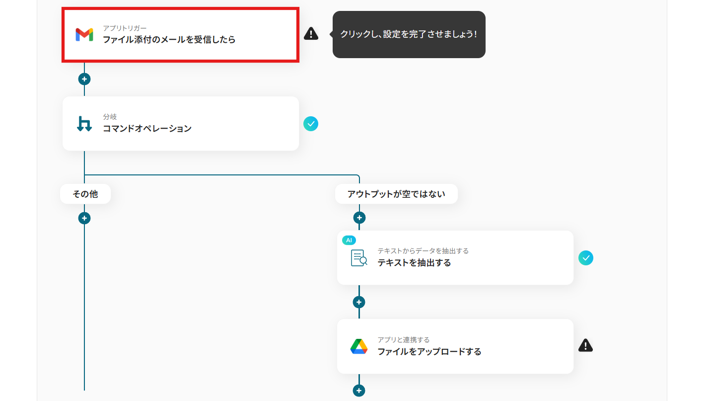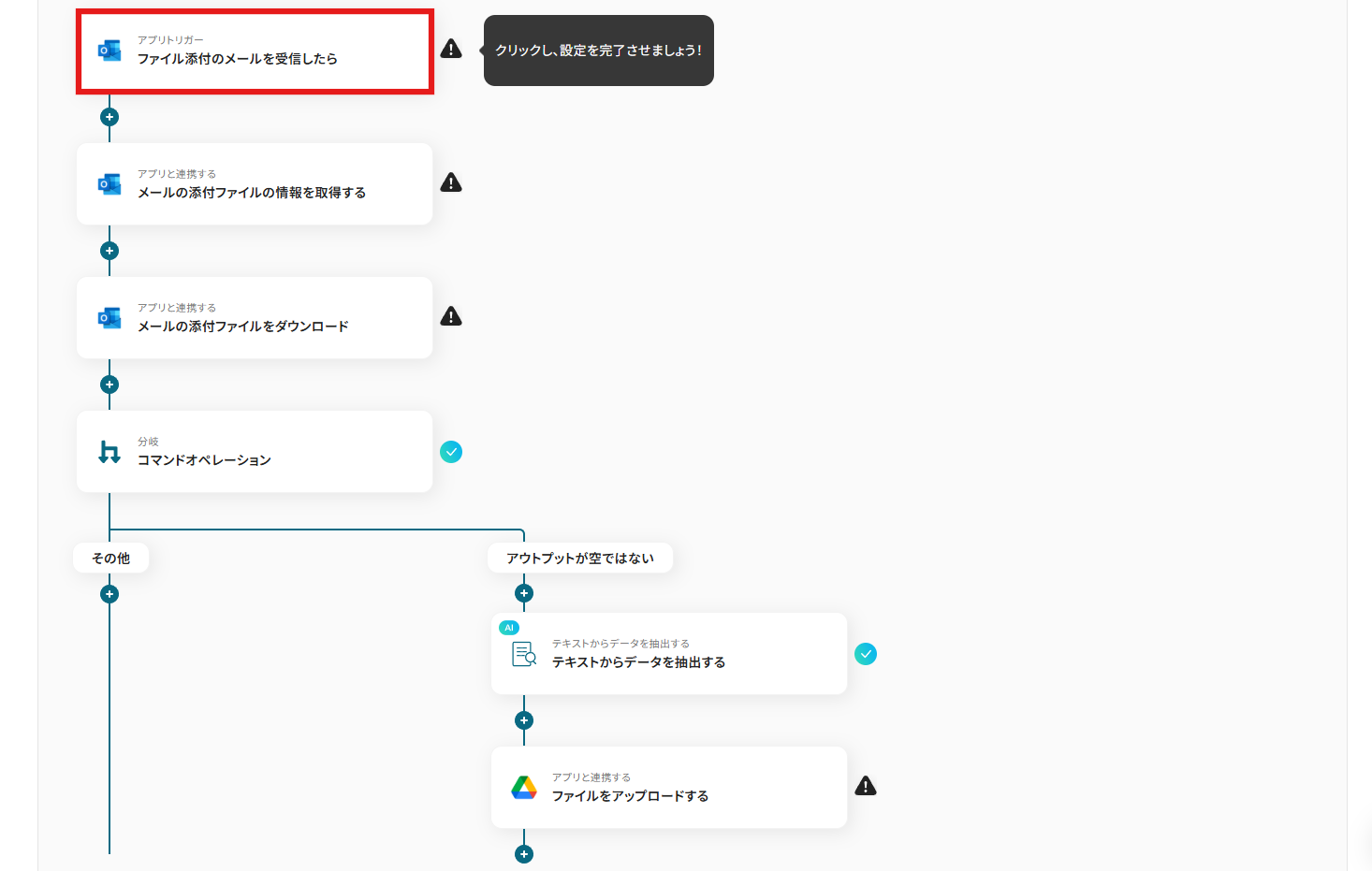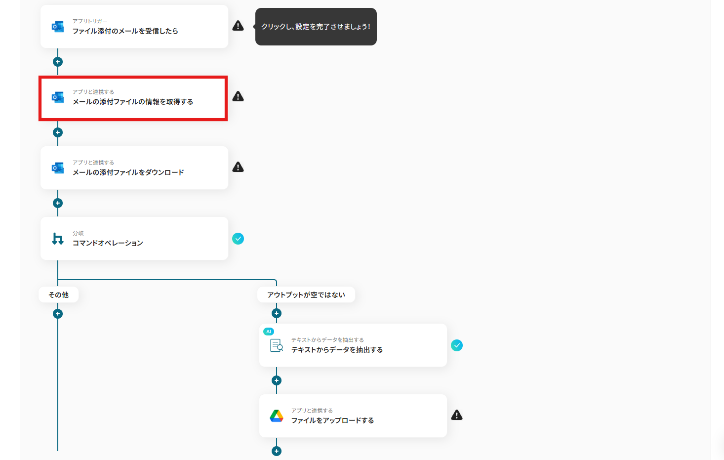テンプレートを活用しているため、設定は完了しています。画像と同じ状態になっているか確認しましょう。この設定をすることにより、添付ファイルがある場合のみ次のアクションが稼働するようになります。
