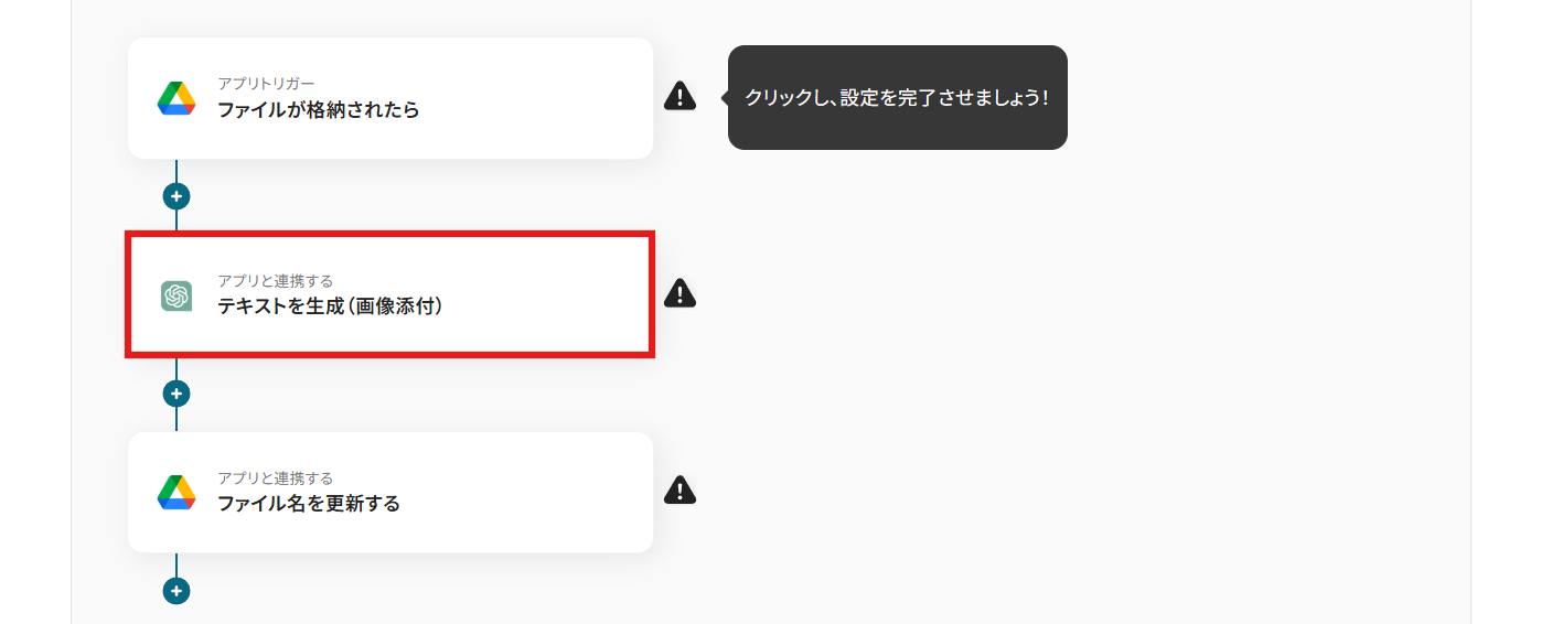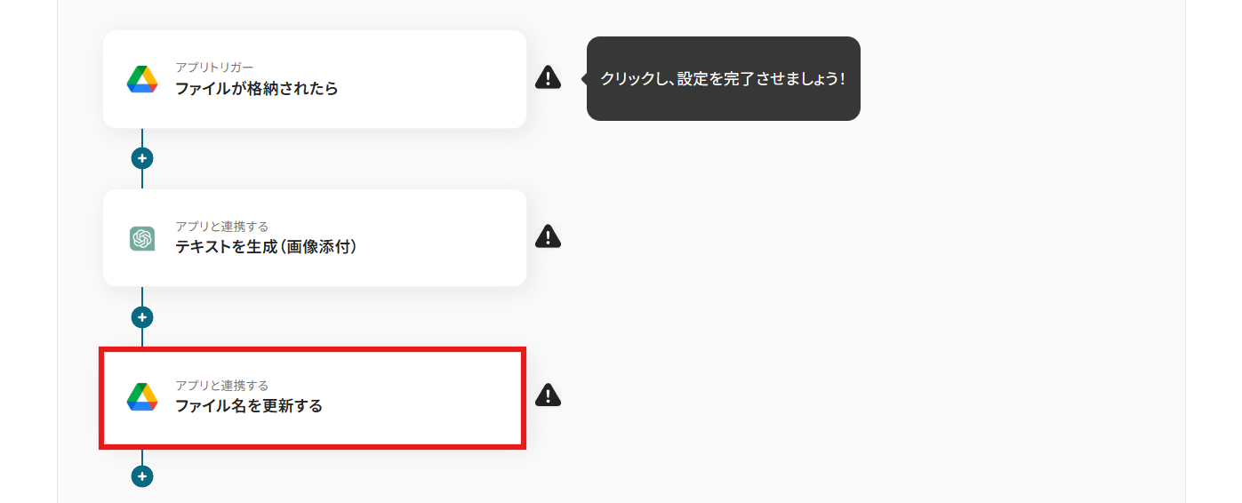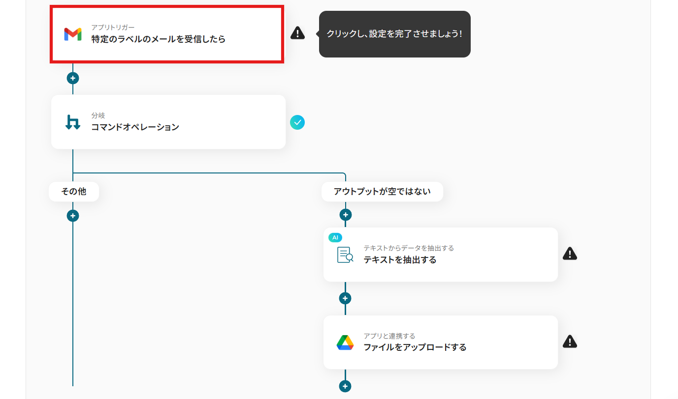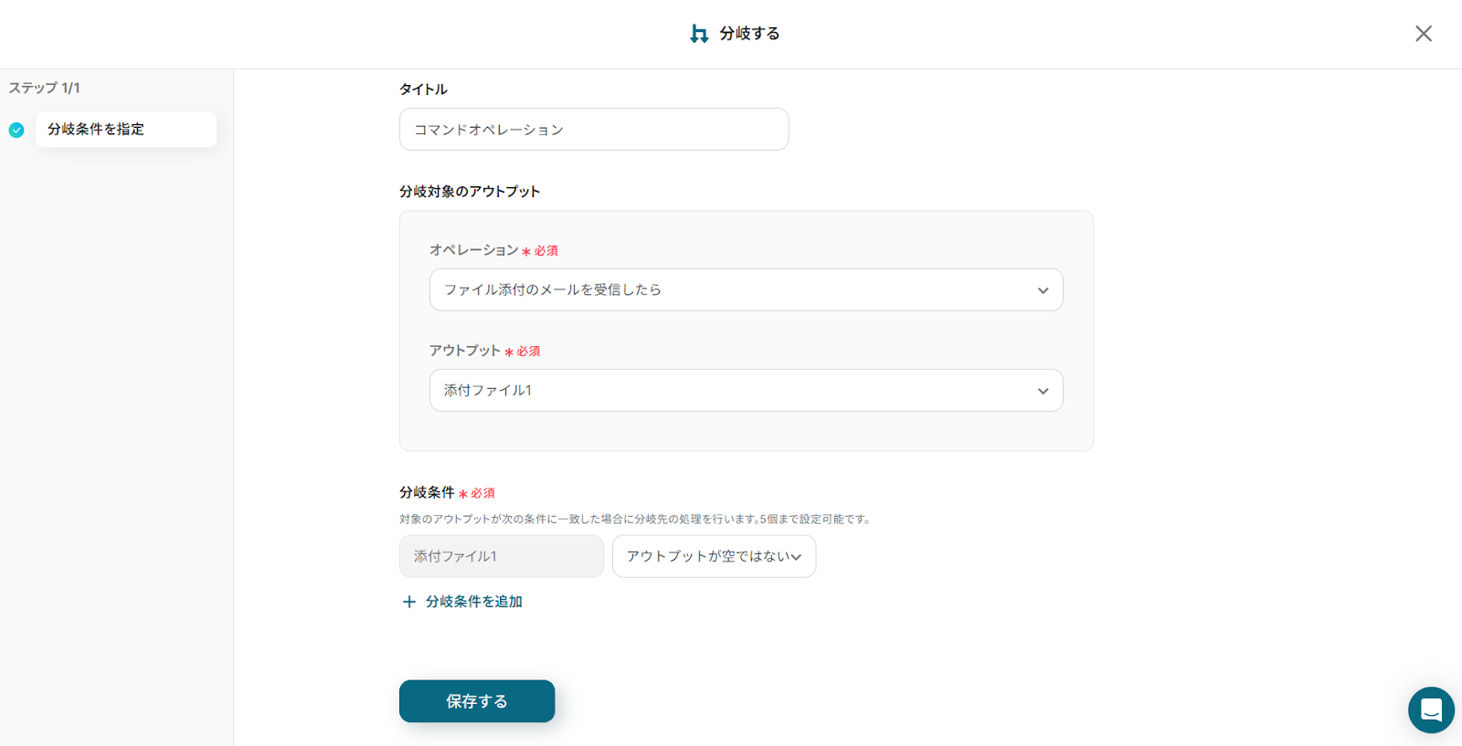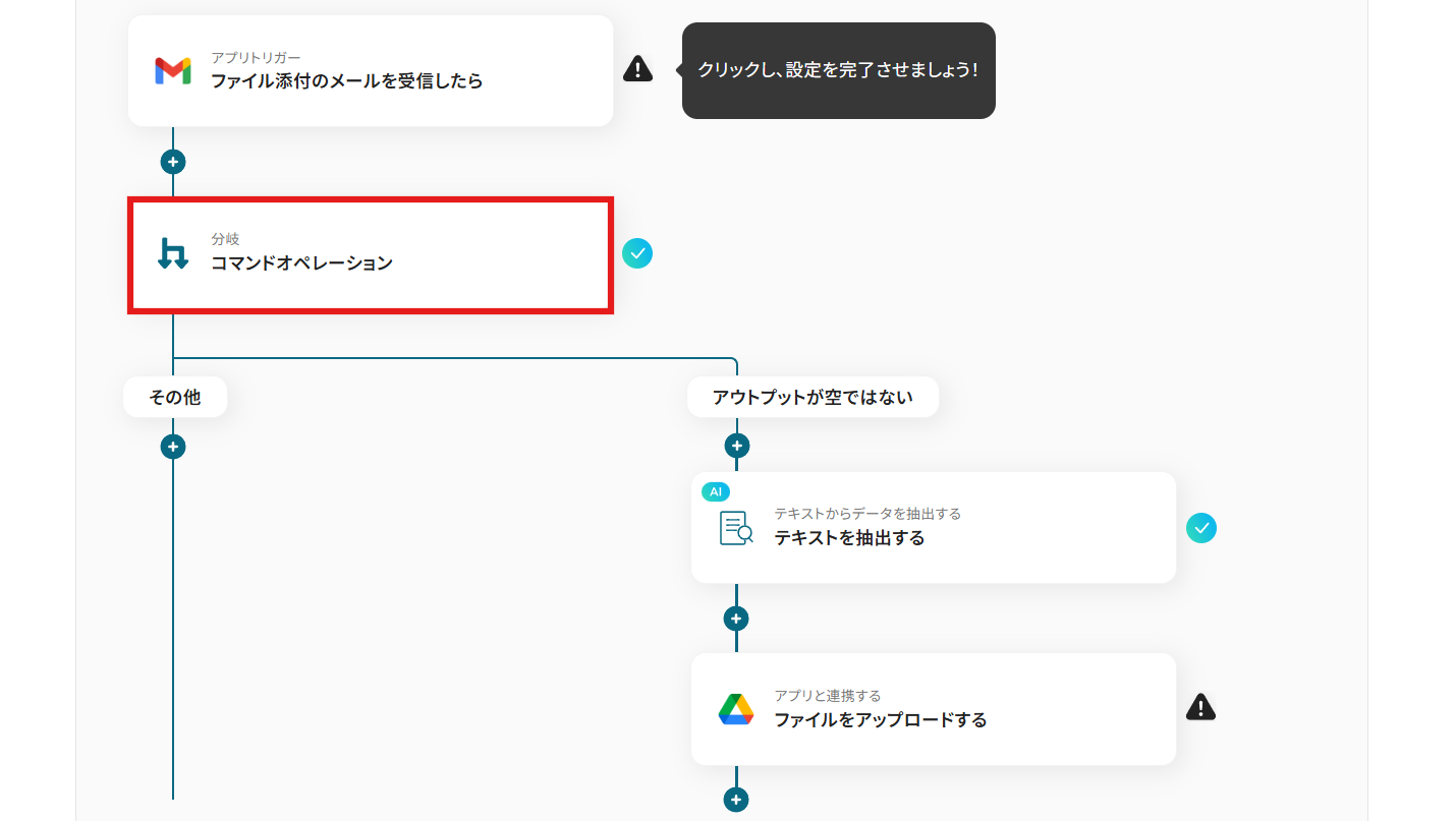 テンプレートを活用しているため、設定は完了しています。画像と同じ状態になっているか確認しましょう。この設定をすることにより、添付ファイルがある場合のみ次のアクションが稼働するようになります。