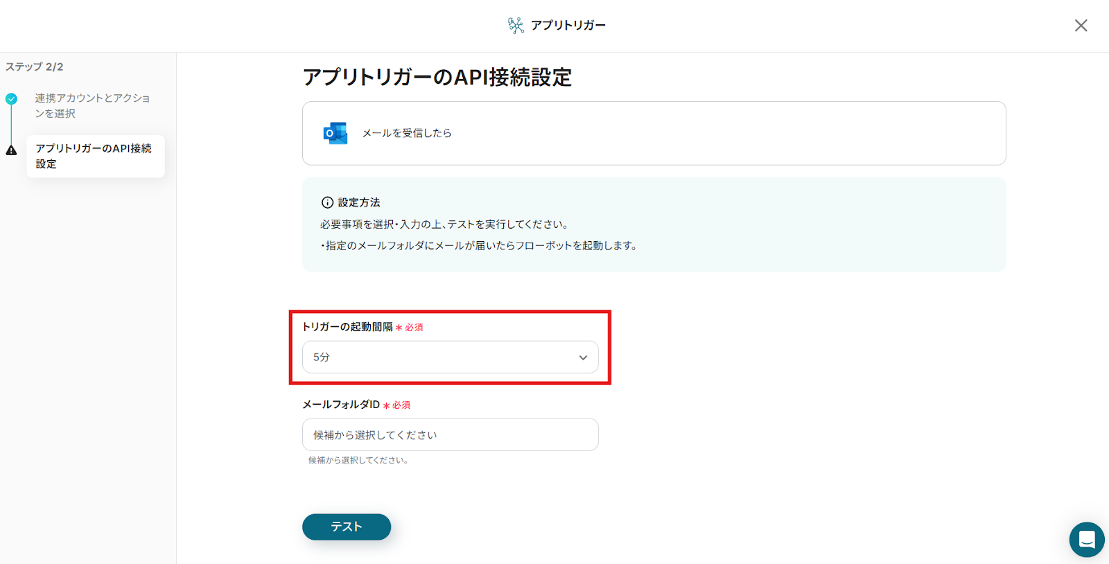 トリガーは5分、10分、15分、30分、60分の間隔で起動間隔を選択できます。