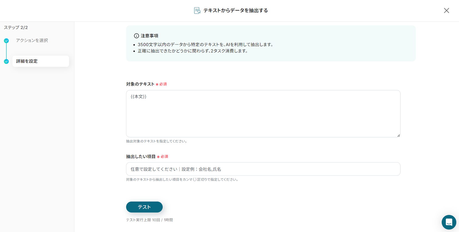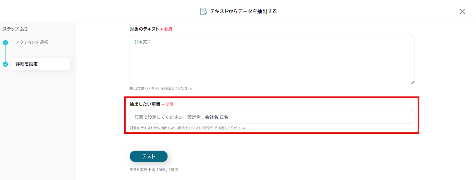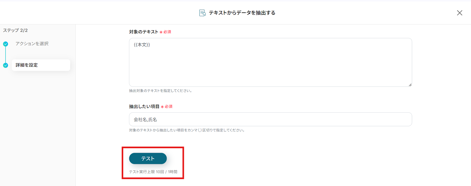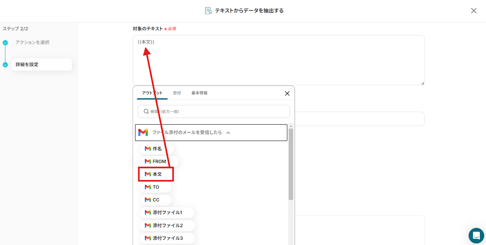 なお、本文から抽出したい具体的な文字列は赤枠部分で設定可能です。