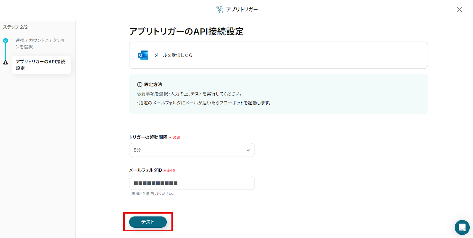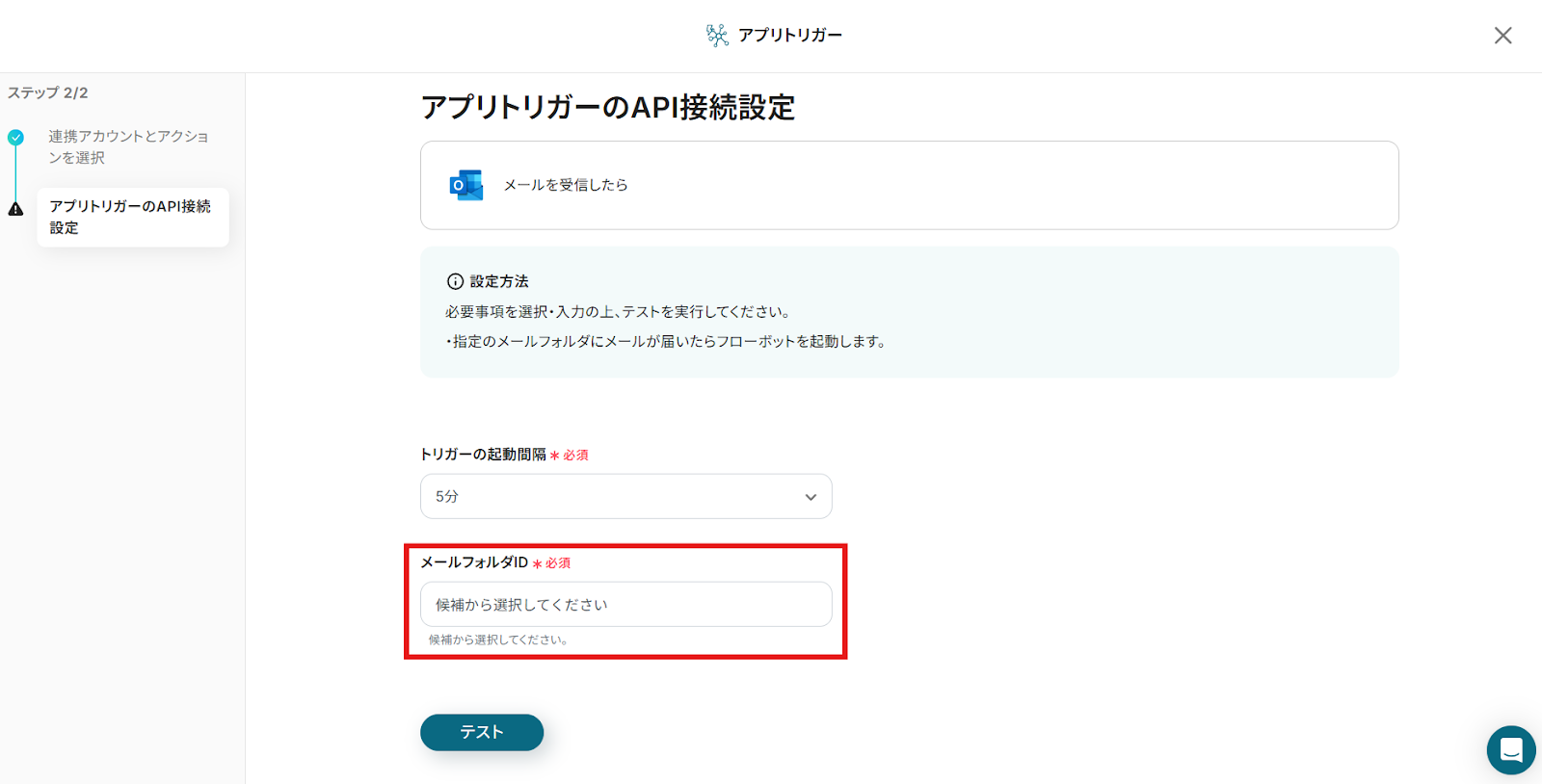 ここまで設定ができたら、テスト用の領収書や請求書ファイルを添付し、Gmailに送信しておきましょう。その後、テストボタンを押します。