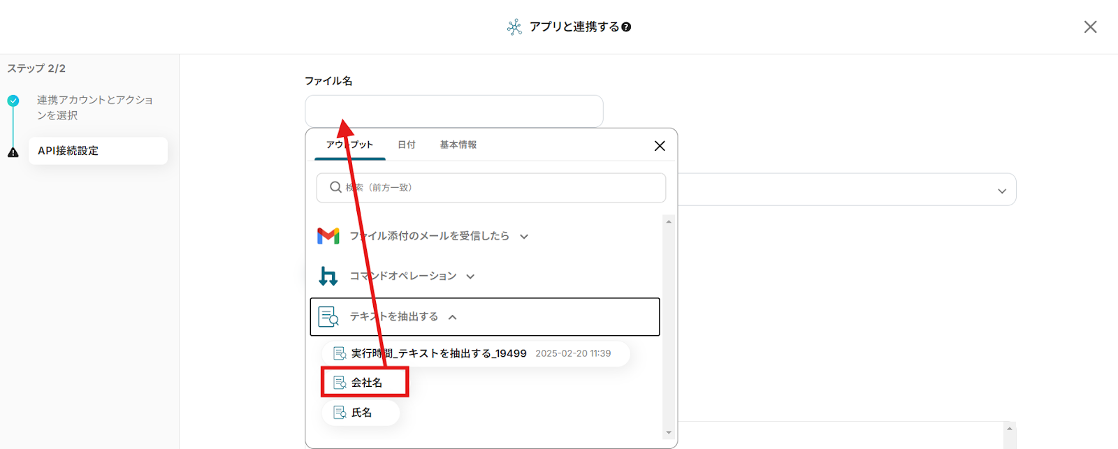 抽出した文字が表示されます。ファイル名にしたいものをクリックで挿入しましょう!
