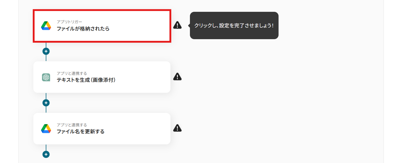 Google Driveのアイコンの「ファイルが格納されたら」を選択してください。次へをクリックしましょう!