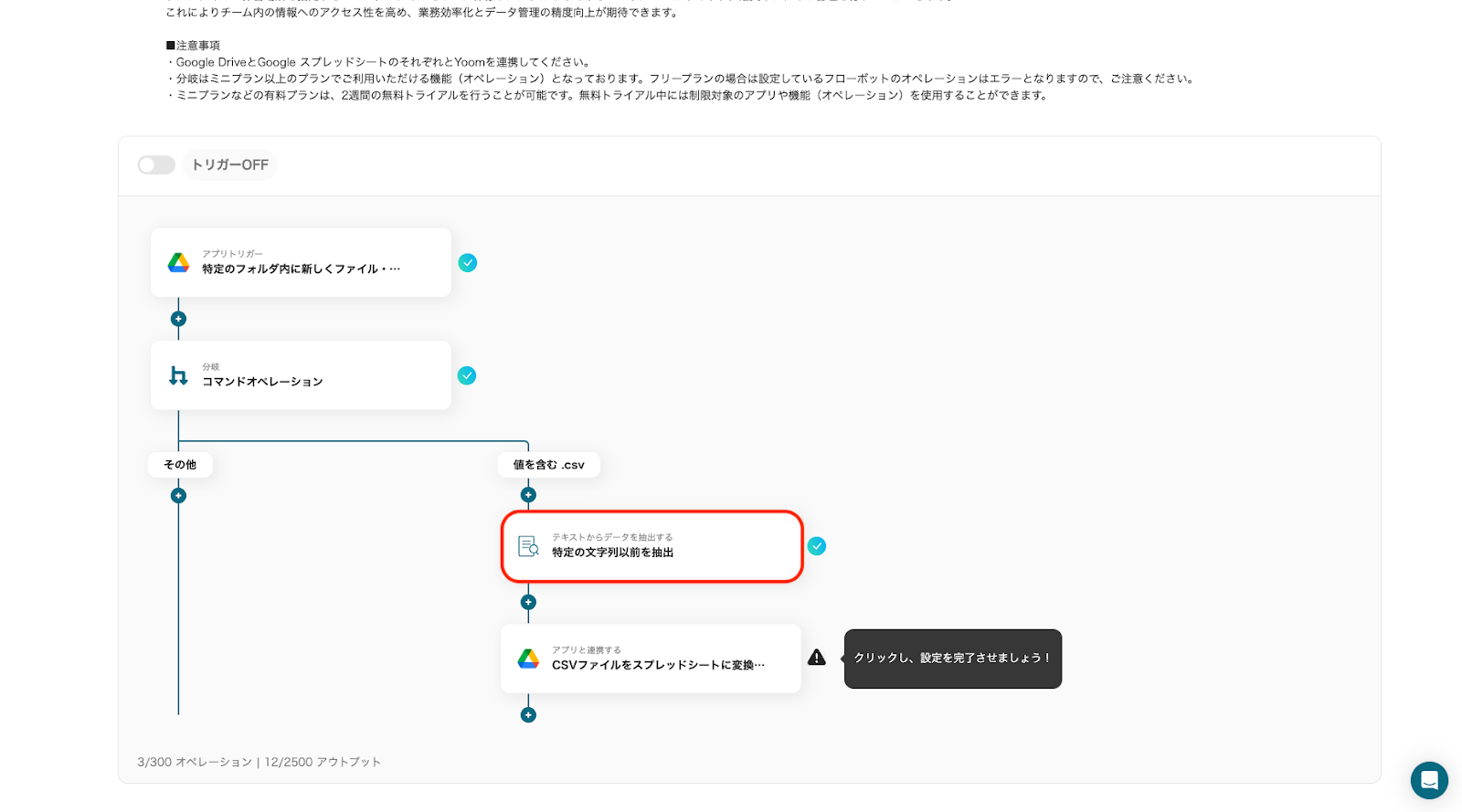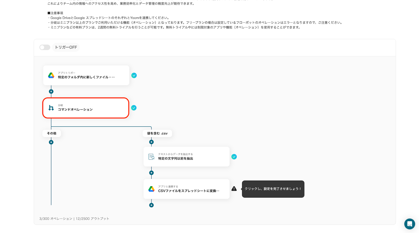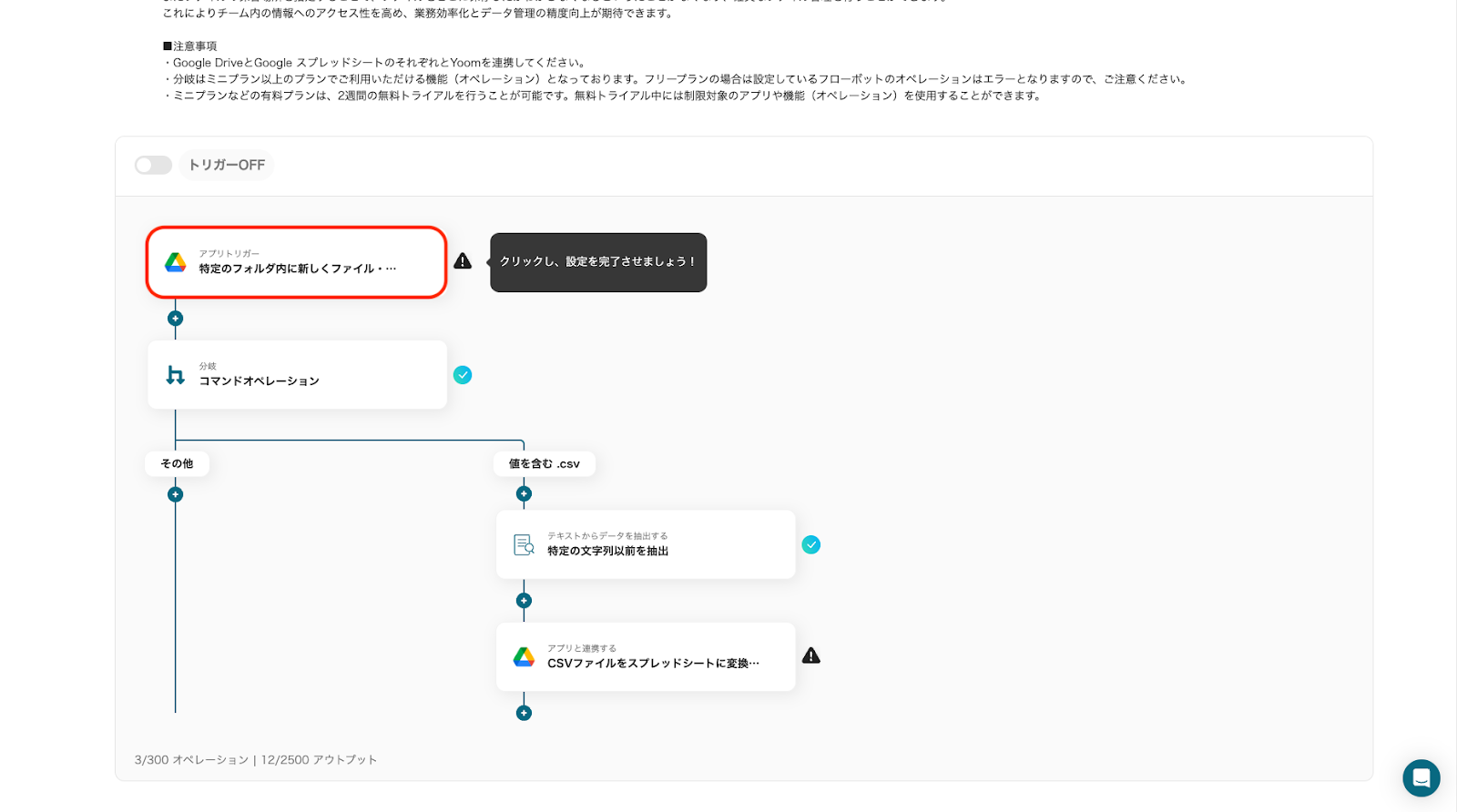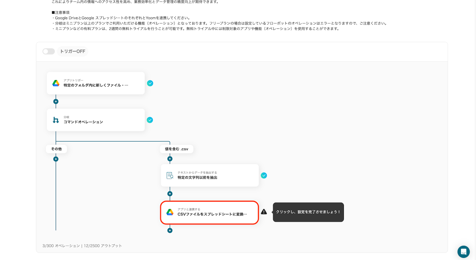 Google DriveのCSVデータをGoogle スプレッドシートに変換しYoomデータベースに転記するフローです。