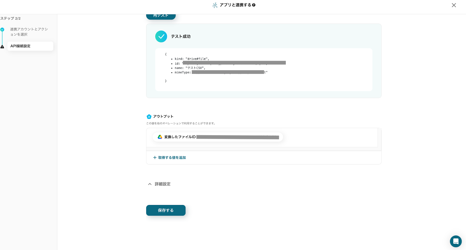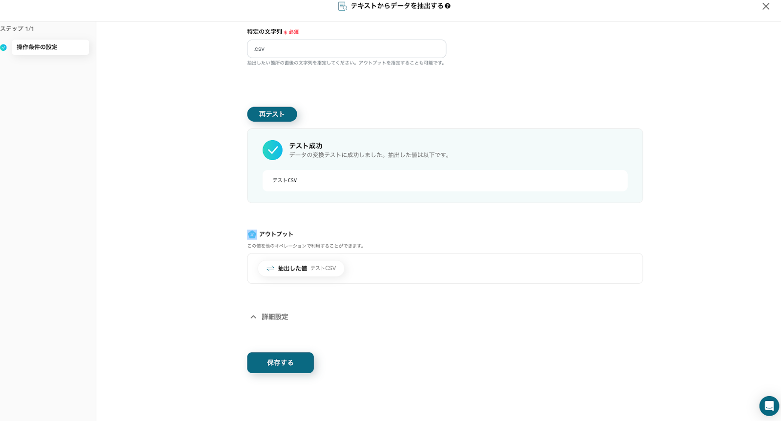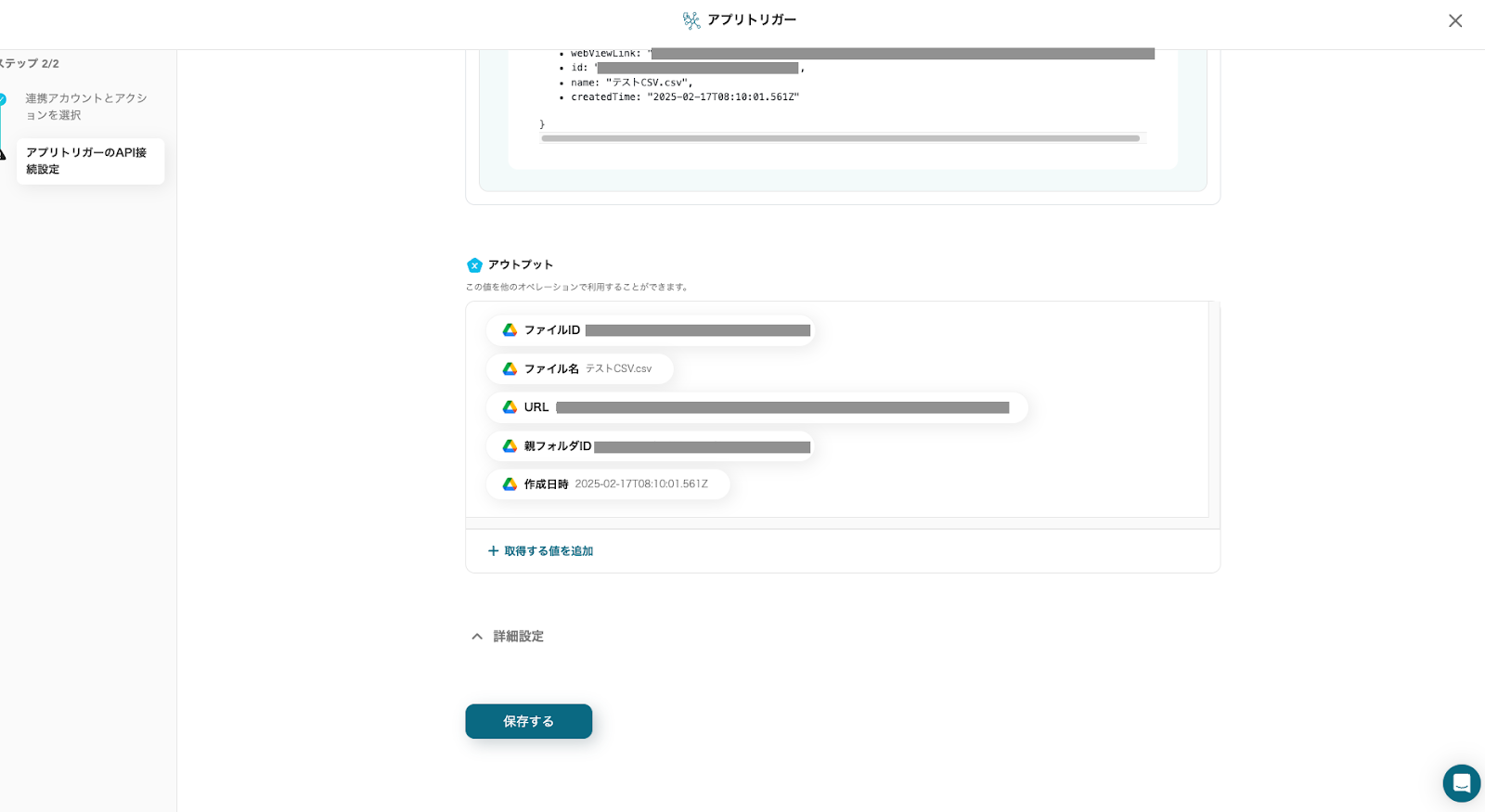 アウトプット(取得した値)を確認し、「保存する」をクリックしてください。