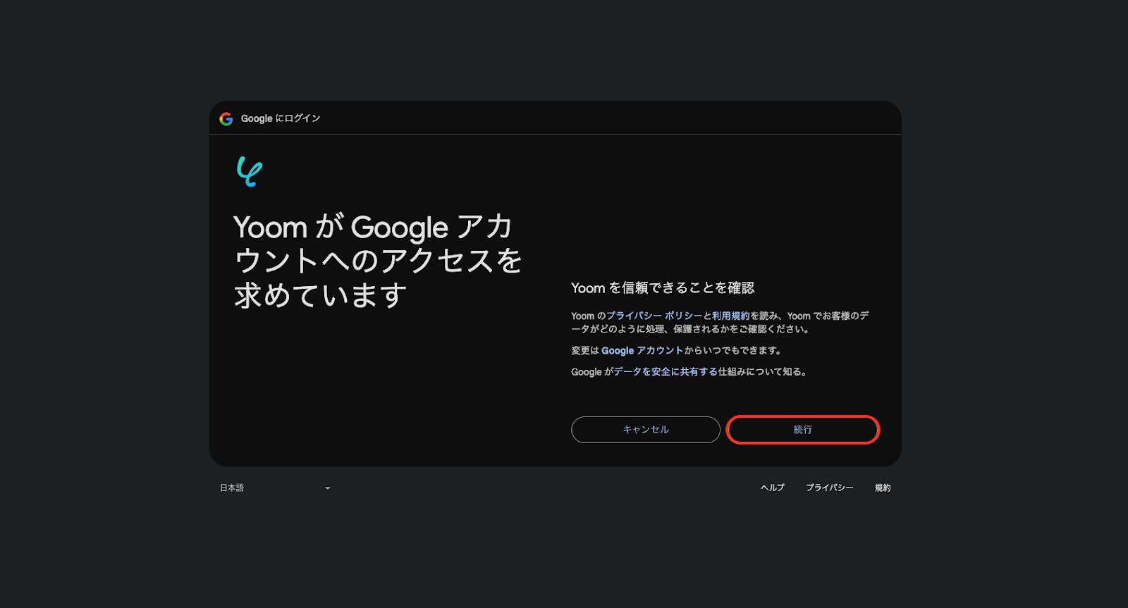 「YoomがGoogle アカウントへのアクセスを求めています」と表示されたページで「続行」を押すと、Google Driveのマイアプリ連携が完了します。