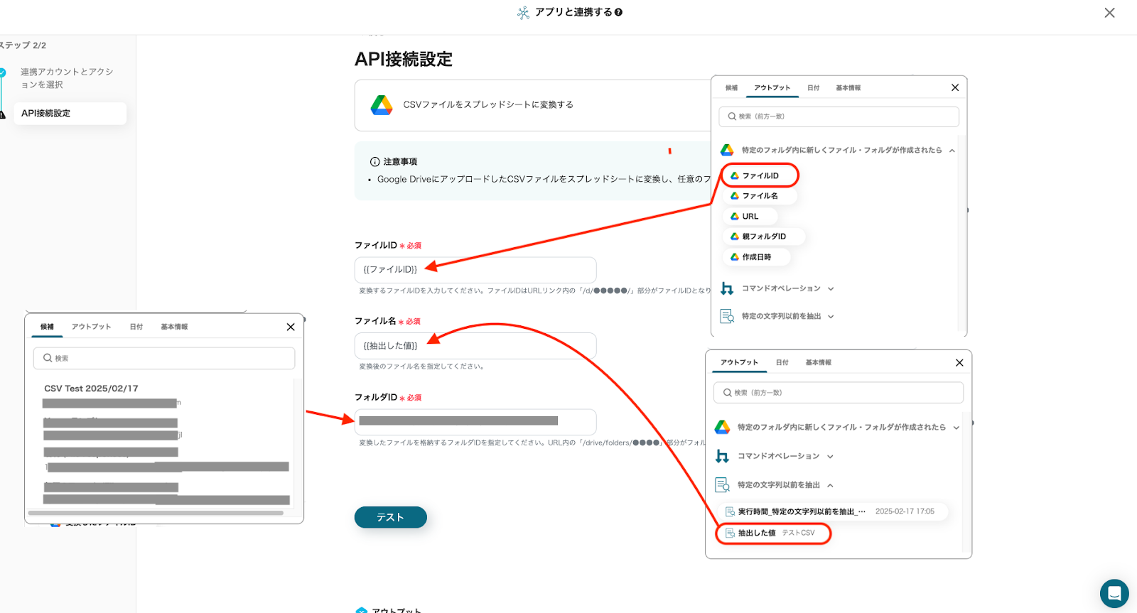 設定が完了したら指定したフォルダにCSVファイルをアップロードし、「テスト」をクリックしてください。