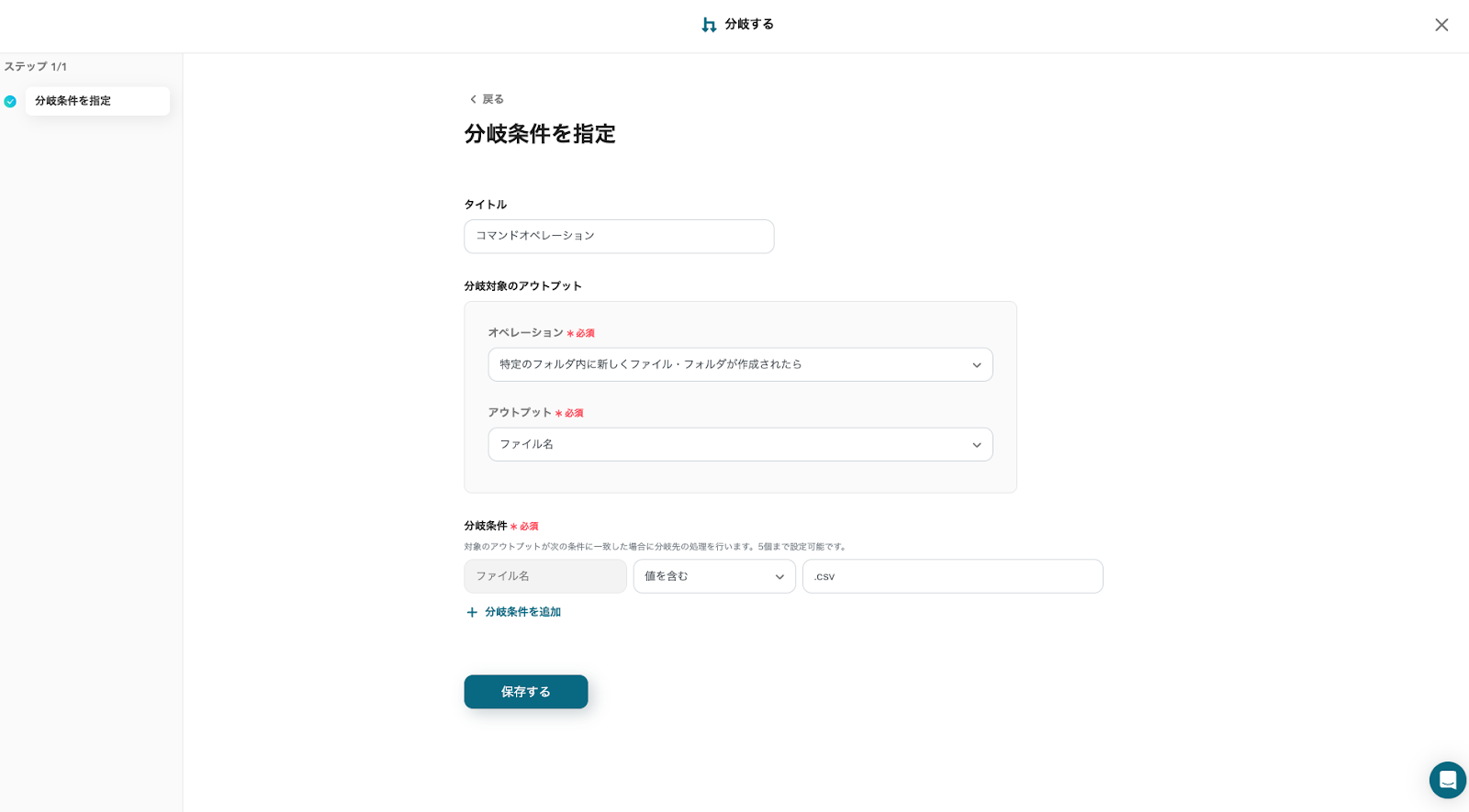 分岐条件はテンプレートを活用しているためすでに設定は完了しています。画像と同じ状態であることを確認したら「保存する」をクリックしてください。