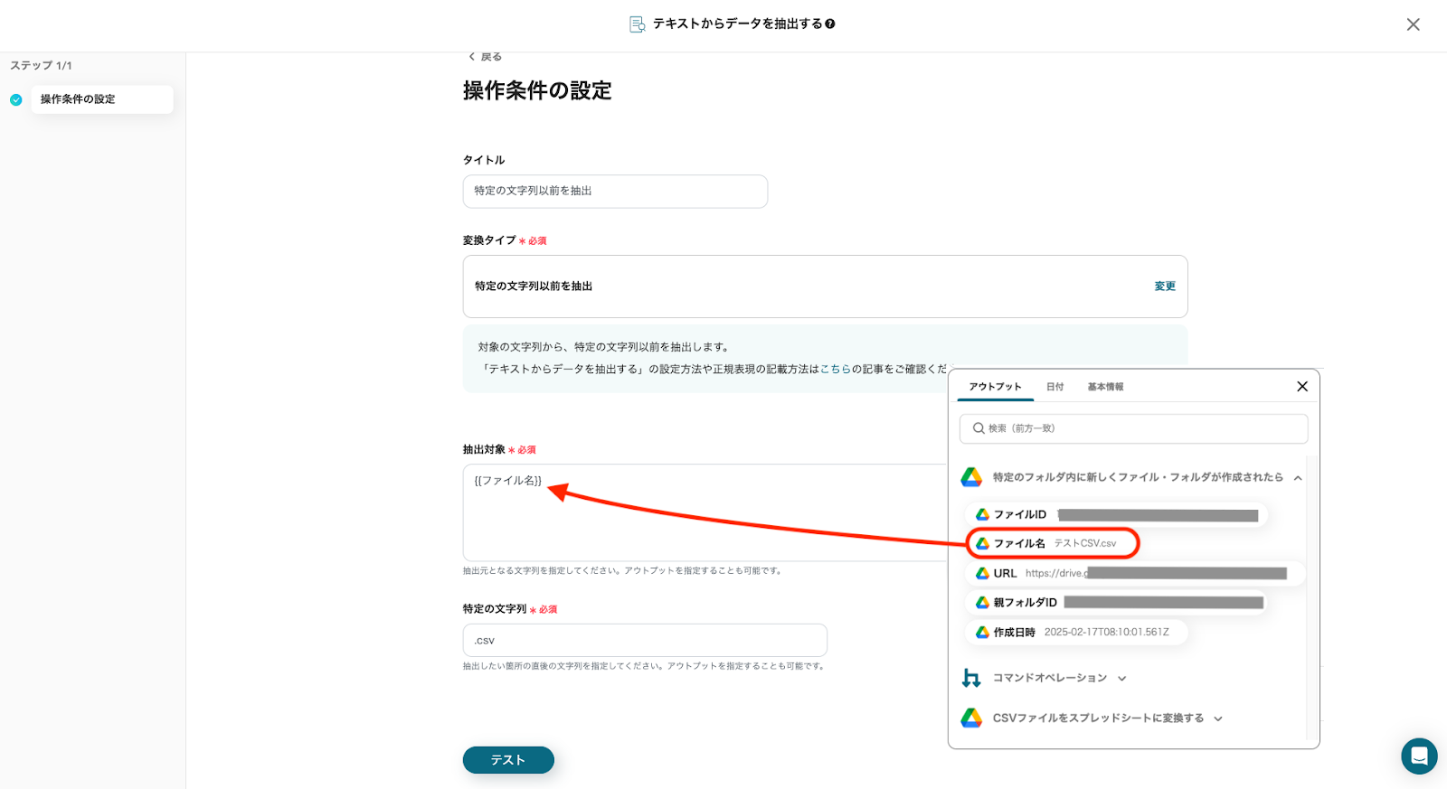 「ファイル名」は、ステップ4で抽出した値を選択してください。
