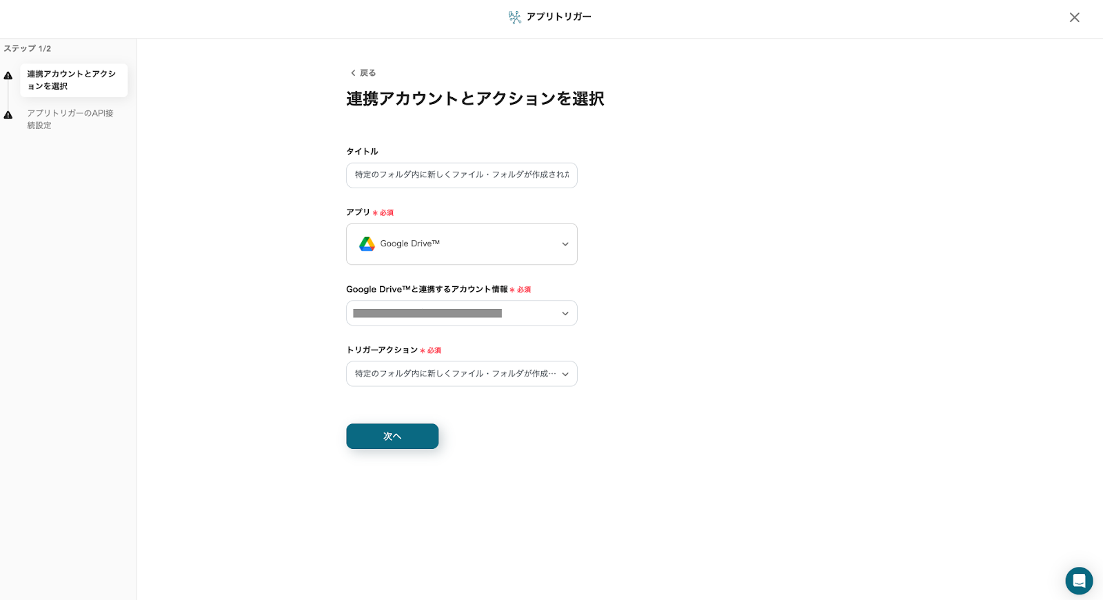 タイトルは編集可能ですが、トリガーアクションは変更せず「次へ」をクリックしてください。