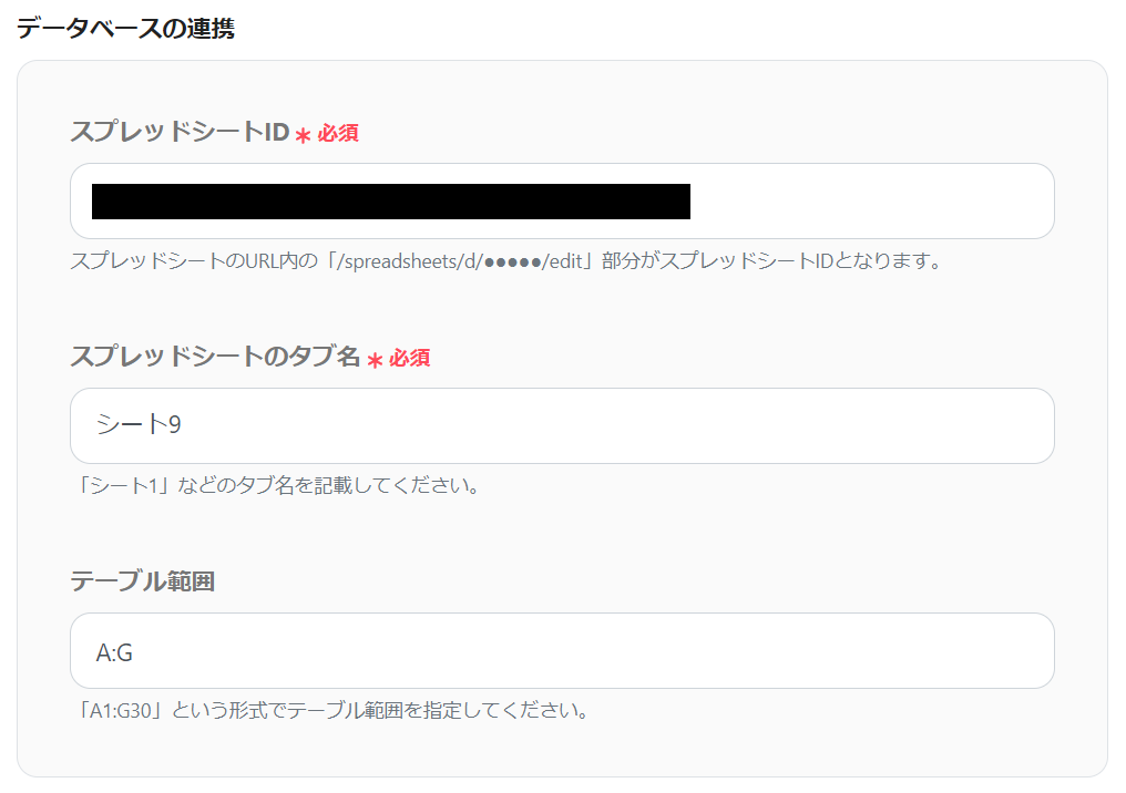その他の項目に関しては用意したGoogle スプレッドシートに依存するため、Google スプレッドシートの内容に沿って入力していきましょう。