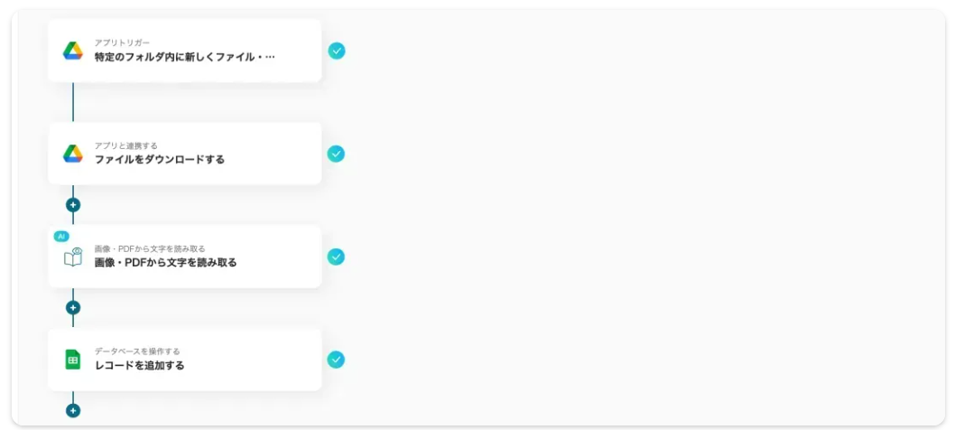 また、フォームに送信された納品書をAIで読み取りGoogle スプレッドシートにデータを追記後、Google Driveに自動で保存する連携も可能です。