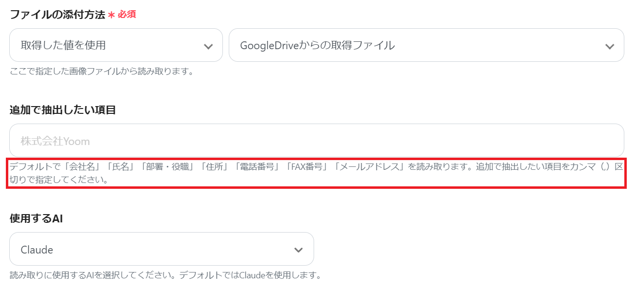 赤枠の通りあらかじめ認識する項目が設定されています。