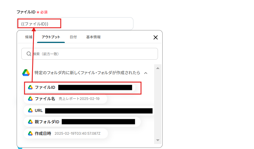 ファイルIDと権限を設定していきます。 ファイルIDはアウトプットからのタブから選択してください。候補のタブではないので、気を付けてくださいね。