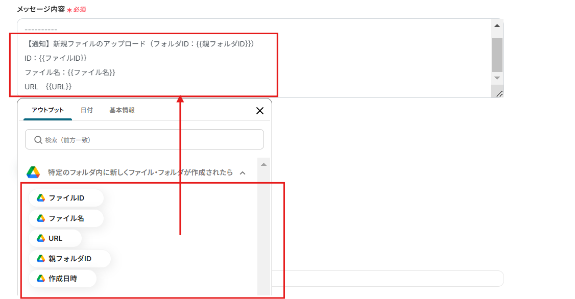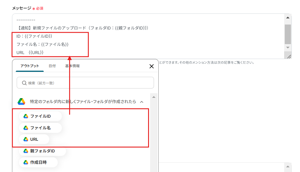 {{二重カッコ内}}の値は、アウトプットから選択できます。