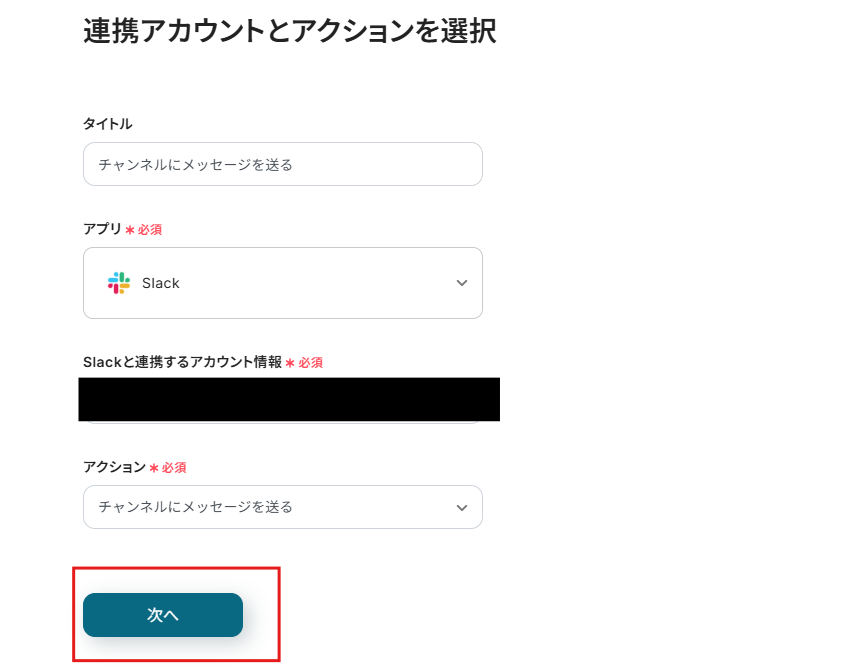 「メッセージ」は以下の設定例を参考に入力してみてください。 このメッセージは、Slackに通知するメッセージの内容です。