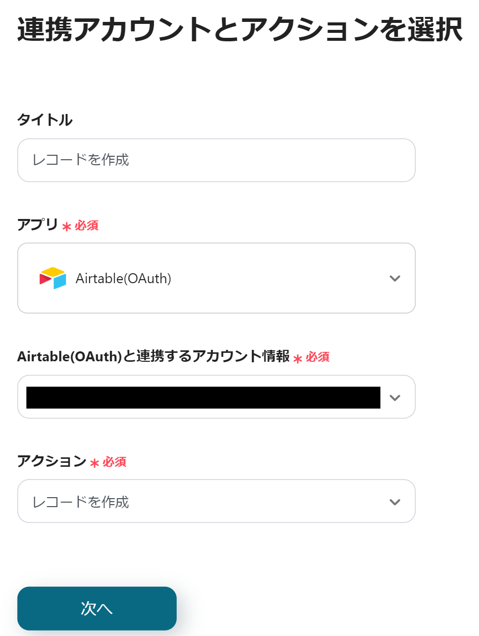 Airtableに取得したファイル情報を追加する設定を行うため、「レコードを作成」をクリックします。