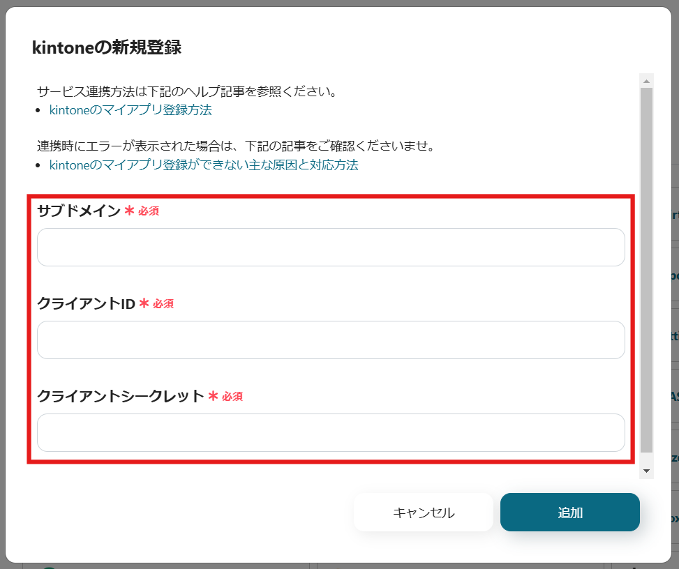Google DriveとkintoneをYoomに接続するマイアプリ登録を最初に行います。