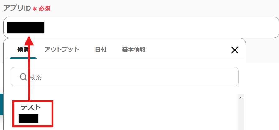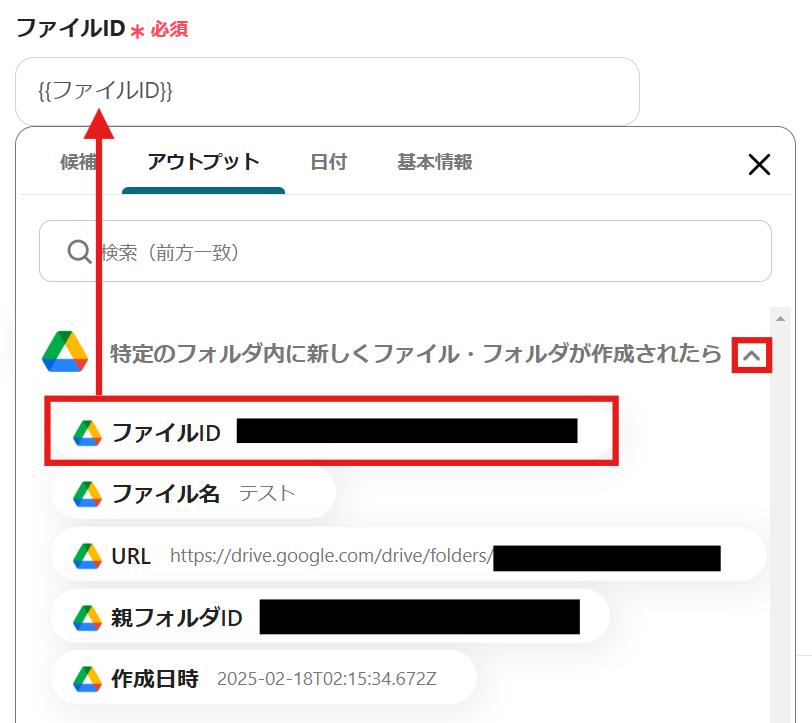 「特定のフォルダ内に新しくファイル・フォルダが作成されたら」のアウトプットを活用して設定を行うので、赤枠内の矢印をクリックしましょう。