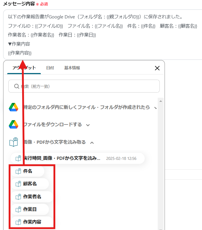 「画像・PDFから文字を読み取る」のアウトプットを使用することで、Chatwork上でファイル情報を確認できます。