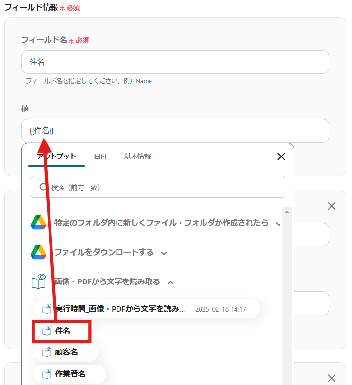 項目名に合うアウトプットを「画像・PDFから読み取る」のアウトプットを活用して設定してください。