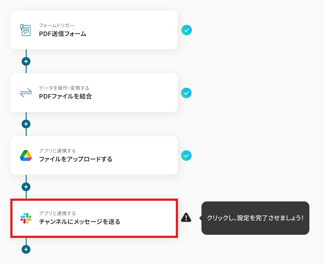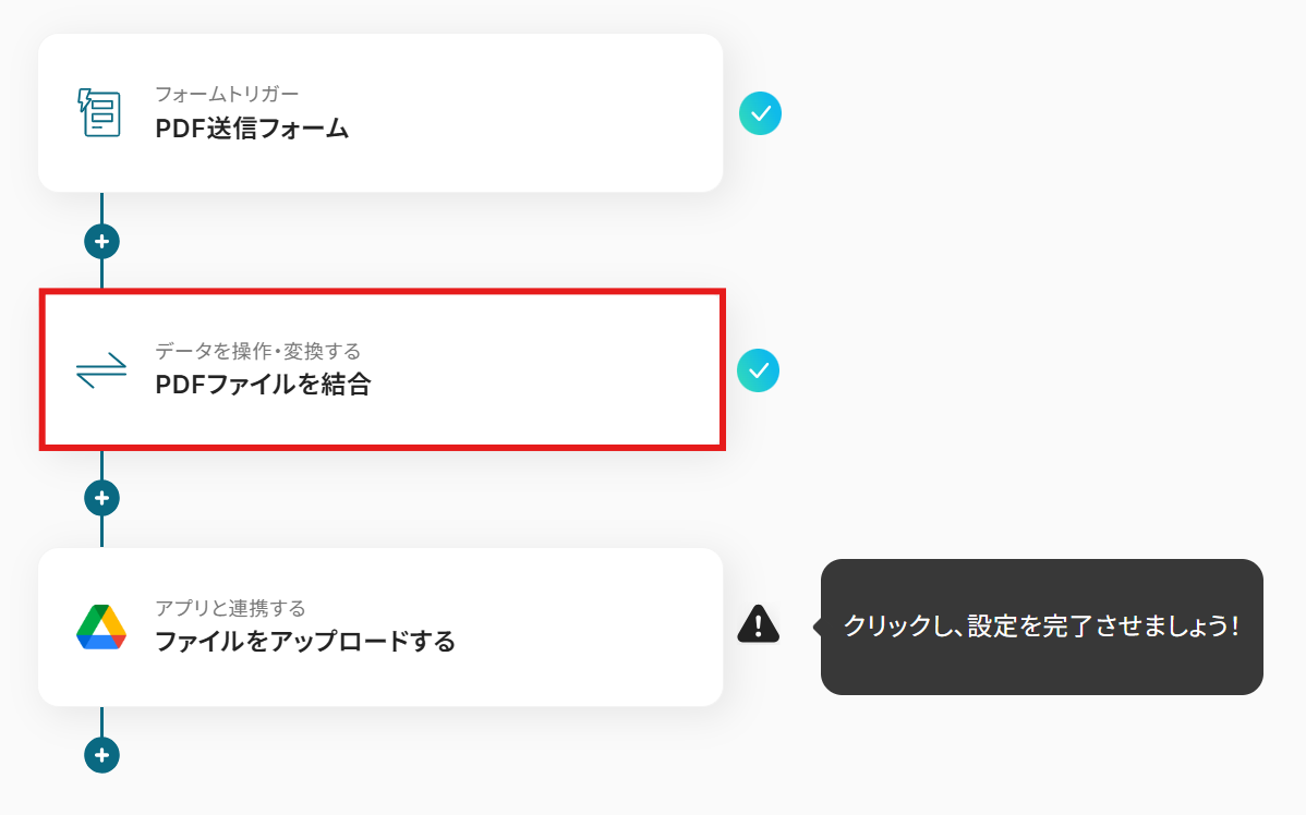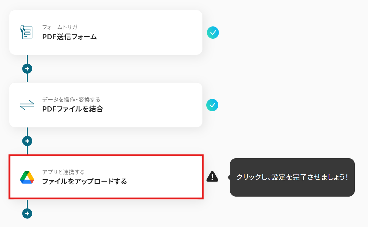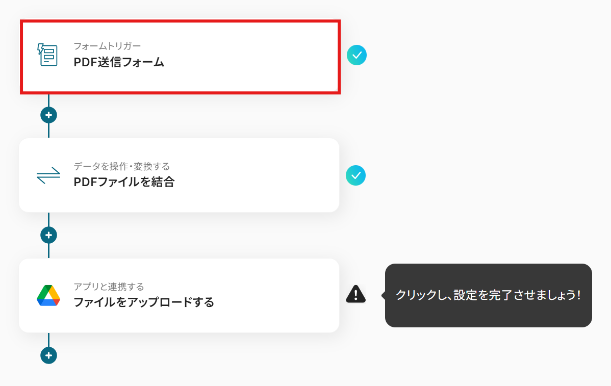 これで、【フォームで受信した複数のPDFを結合し、Google Driveに保存する】というフローが完成しました。